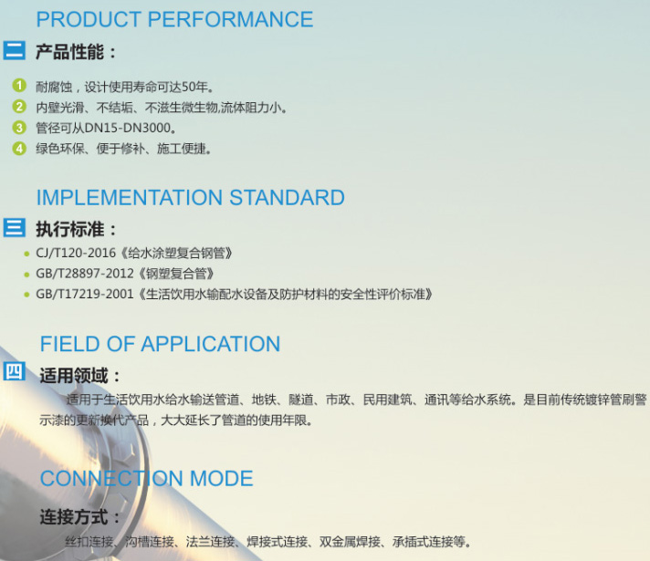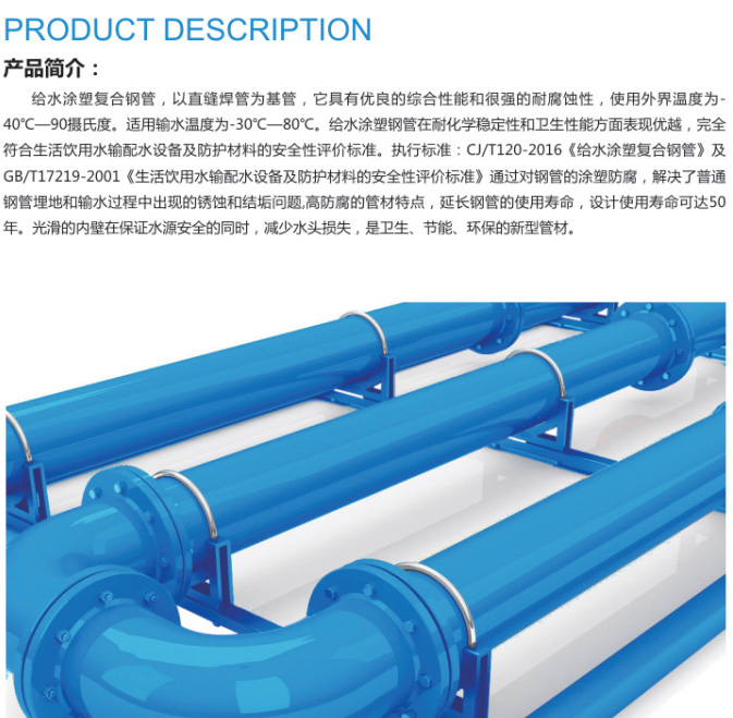 簡介:給水涂塑復(fù)合鋼管,以直縫焊管為基管,它具有優(yōu)良的綜合性能和很強的耐腐蝕性,使用外界溫度為-40℃-90攝氏度,適用輸水溫度為30℃-80℃.給水涂塑鋼管在耐化學(xué)穩(wěn)定性和衛(wèi)生性能方面表現(xiàn)優(yōu)越,完全符合生活飲用水輸配水設(shè)備及防護材料的安全性評價標(biāo)準(zhǔn)。
