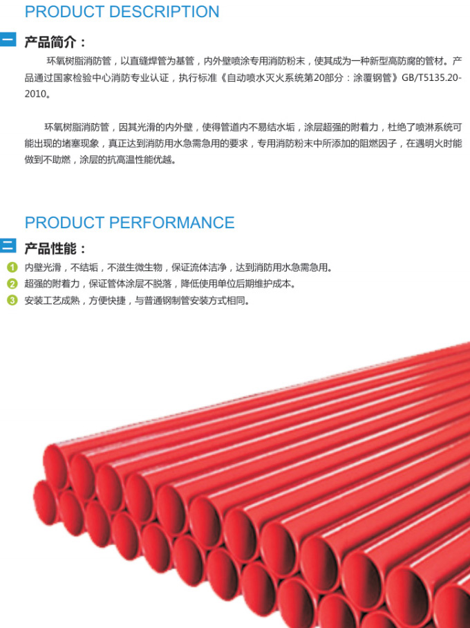 環(huán)氧樹脂消防管,以直縫焊管為基管,內(nèi)外壁噴涂專用消防粉末,使其成為一種新型高防腐的管材。產(chǎn) 品通過國家檢驗(yàn)中心消防專業(yè)認(rèn)證,執(zhí)行標(biāo)準(zhǔn)