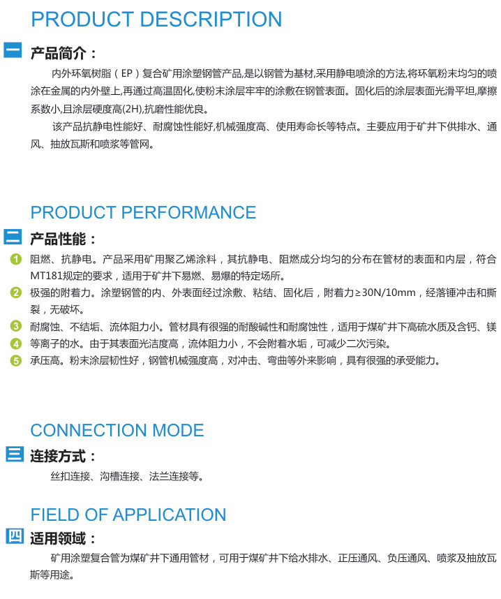 內(nèi)外環(huán)氧樹脂(EP)復(fù)合礦用涂塑鋼管產(chǎn)品,是以鋼管為基材,采用靜電噴涂的方法,將環(huán)氧粉末均勻的噴涂在金屬的內(nèi)外壁上,再通過高溫固化,使粉末涂層牢牢的涂敷在鋼管表面。