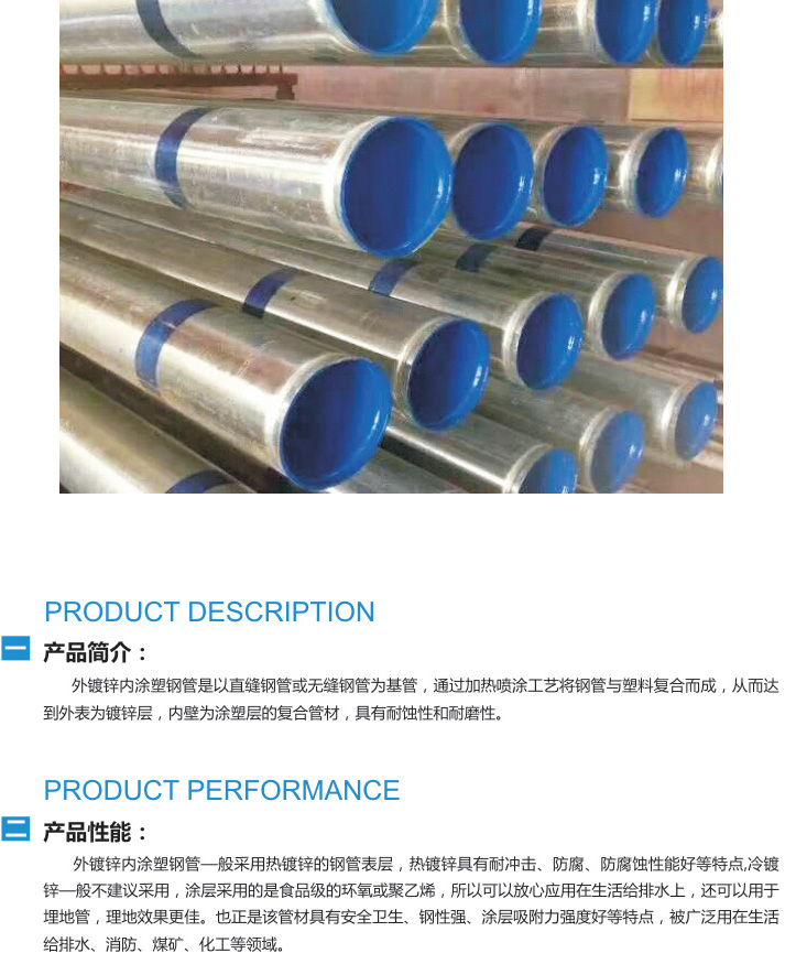 外鍍鋅內(nèi)涂塑鋼管是以直縫鋼管或無縫鋼管為基管,通過加熱噴涂工藝將制管與理科復(fù)合而成,從而達(dá)到外表為鍍鋅層,內(nèi)壁為涂塑層的復(fù)合管材,具有耐蝕性和耐磨性。